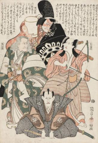 "Sugoi! 200 Years of Japanese Art," KIA, Galleries 2 & 5 (May 13, 2023 - September 24, 2023)Label TextThis is the center panel of a triptych advertising the farewell performances played by the actor Nakamura Utaemon III. The Osaka-Kyoto area actor bows to the audience after three years at the Nakamura-za Theater in Edo. The text recounts his parting speech, in which he explains how much he regrets leaving. One reason for going home, he says, is because his elderly mother is unwell. Behind him, and on flanking panels, the actor is pictured in nine different roles. In keeping with the traditional focus of the Utagawa school, more than half of Kunisada’s print designs consisted of kabuki actors in current, popular plays. [Label for “Sugoi! 200 Years of Japanese Art", 2023]