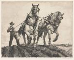 Label TextBest known for his mural and figure paintings, the Hungarian-born Szanto also earned a reputation as an accomplished etcher. Although he made his home in New York City for much of his life, his work was admired and acquired by collectors throughout the country. In his etchings, Szanto often turns to genre and landscape scenes for his subjects. This frontal view of a farmer with his team of horses demonstrates the dramatic sense of design and fine draughtmanship typical of Szanto’s printmaking.