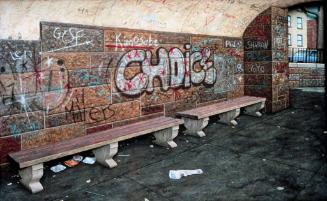 "The names of doctors and nurses who were very good to us, other children who touched us in the clinic, and even some medical slang grace this wall. The drawing of the bicycle under the bench was a drawing Samantha did in school. The get-well note was my expression of Hope. Samantha Ann MacGowan died on July 5, 1993; yet, in my heart and my art, she will always be very much alive."