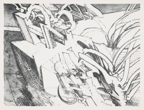 Exhibition History"Embracing Diverse Voices: African-American Art in the Collection of the Kalamazoo Institute of Arts," KIA Galleries 3&4 (Oct. 3 - Nov. 29, 2009). "Embracing Diverse Voices: 80 Years of African-American Art," KIA Traveling Exhibition, Bakersfield Museum of Art (Dec. 13, 2012 – Mar. 10, 2013). "Embracing Diverse Voices: 90 Years of African-American Art," KIA Traveling Exhibition, Tyler Museum of Art, Tyler, TX (January 17 - March 20, 2016). "Surrealish: The Absurd and Unexpected," KIA Galleries 2 & 5 (June 4 - September 11, 2022)Label Text"Chicago-based artist Richard Hunt is most well known for his sculptural works. However, influences of Surrealism, various African arts, Cubism, and Abstract Expressionism can be seen in his work regardless of the medium. In this untitled work, Hunt seems to create an imaginary landscape with a twisted, tree-like organic form with wild fronds in the foreground, and angular, steel-like structures—perhaps referencing his inclination for large-scale sculptures—atop a jagged cliff in the background. Hunt leaves the viewer with little to no clues about this scene’s meaning. Perhaps it is a landscape or perhaps it is merely an exercise in lines and forms." [from the exhibition Surrealish: The Absurd and Unexpected, 2022]