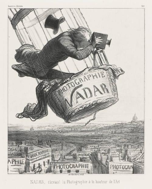 Daumier, ever the satirist, exaggerates the situation by showing a Paris skyline in which nearly every building has a marquee proclaiming “PHOTOGRAPHIE” to every passerby and Nadar, oblivious to his loss of his hat, is focused monomaniacally on the aerial photography he pioneered. Nadar, a brazen self-promoter, has evidently affixed a smaller version of the huge sign that decorated his studio to his balloon basket. Daumier’s caption mocks Nadar and other photographers’ efforts to establish their medium’s reputation as an art form at a time when most viewed it as an uncreative commercial process.