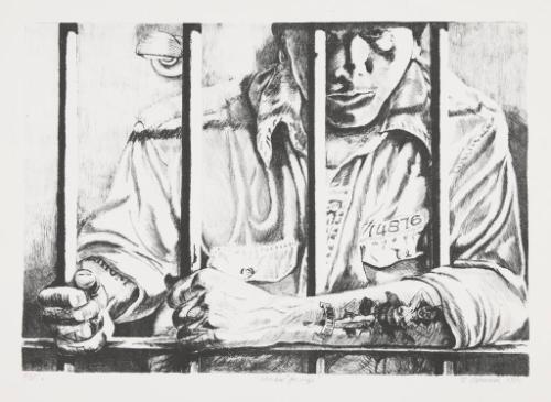 "Resilience: African American Artists as Agents of Change," [Travel Version] at the Dennos Museum Center, Traverse City, MI (June 6, 2021 - August, 15, 2021)Label TextA prison inmate looks out from his cell, his right eye hidden behind the bars that contain him. This young man is "marked" in many ways. He is literally marked by the tattoos on his body: the half-naked woman posing over the words, "Born to Die" on his left forearm, the classic "Mom" inscription on his right and the three tears on his left cheek. But he is also marked by past mistakes and societal influences which are symbolized by his prison identification number, 14876.