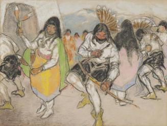 Having visited Santa Fe as a child and studied religion as a youth, it is perhaps unsurprising that Henderson (alongside his wife Alice, a writer) took a serious professional interest in the religious cultures of the region’s Indigenous and Hispanic peoples soon after arriving in 1916. The Snow Bird Dance, pictured here, was a subject featured in depictions of San Ildefonso Pueblo by numerous early twentieth century artists. Henderson’s drawing recreates and reiterates touristic fascination with Indigenous ceremonials that helped make them arguably the Southwest’s greatest attraction to white visitors in the early twentieth century. Though tourists typically knew little about the religious or cultural significance of such ceremonies, the elaborate costumes and dances that they incorporated fueled the fires of exotic fascination that propelled the region’s tourism industry as a whole.There are no works to discover for this record.