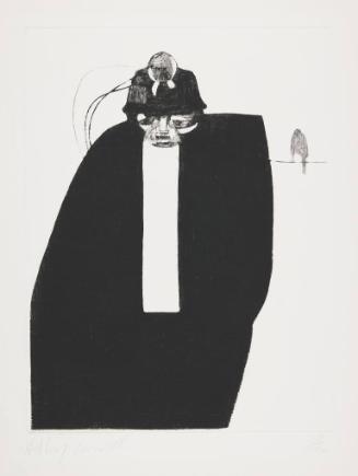 Label TextThe pose of the figure and the artist's style work together to depict the Miner as self-contained, inwardly oriented, and isolated. Currell has used a single black shape to describe the body of the miner. It strongly contrasts with the white background. As a result, the figure appears stark and isolated, as if he were locked in his body. The pose is hunched over, his head down. The arms and hands disappear into the black shape of his body. The result is a sense of self-containment and fatigue.There are no works to discover for this record.
