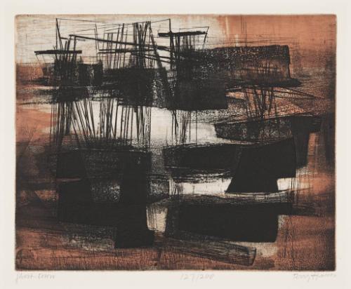 Label Textfrom Traveling Exhibition text: Haass, a European woman artist, has all of the intaglio techniqes--etching, engraving and color aquatint--in this print to suggest an eerie quality of light. A different plate was required to print each color in this work.