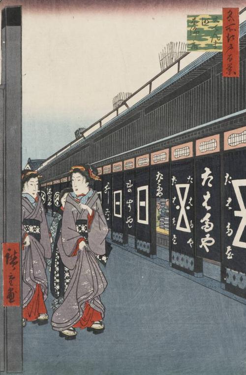 "Impressions: Printmaking in Japan," Kalamazoo Institute of Arts Joy Light Gallery of Asian Art (Apr. 1 - July 23, 2017).Label TextTwo geisha (female entertainers) and an attendant return home, perhaps a little tipsy after an engagement. At this late (or very early?) hour, the commercial street is otherwise empty. We can just peek into one of the shops selling cotton fabric—either the last to close in the evening or the first to open in the morning. The converging lines of the architecture along the lane indicate Hiroshige’s awareness of Western-style perspective, which creates a dramatic illusion of depth.