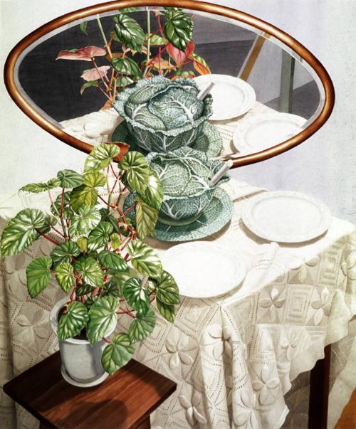 Mirror Image brings together many of these criteria in a thought-provoking composition where reality and representation collide. Reflected in a large oval mirror is an arrangement of domestic objects including a ceramic tureen shaped like a cabbage. Freckelton asserts the quiet dignity of each object with her meticulous technique and attention to detail.