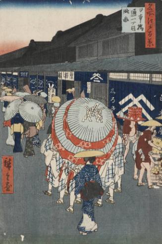 Exhibition HistoryRound and Round, Ethel Denton Groos Gallery, November 4, 2017 - March 4, 2018Label TextA huge, two-tiered parasol shelters a group of Sumiyoshi dancers strolling down a main street of Edo (Tokyo) in the Nihonbashi district. Dancing around a large, stationary parasol was part of an agricultural ritual originating at the Sumiyoshi Shrine near Osaka. By Hiroshige’s time, seasonal minstrels who performed dances at various shrines were called Sumiyoshi dancers.