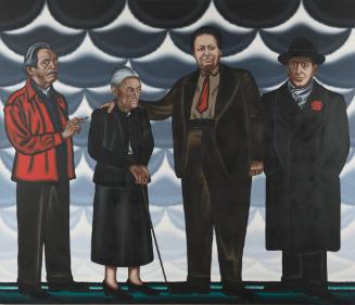 "Legendary Voices: Art for the Next Century," KIA (September 7 - February 18, 2025)Label TextRoger Brown painted this work as a tribute to four great American artists who influenced his work: Thomas Hart Benton, Georgia O'Keeffe, Diego Rivera, and Marsden Hartley. Brown identified with these innovative, 20th-century artists who worked outside the mainstream. Each with a unique vision (like Brown), these artists created their own distinct painting styles.