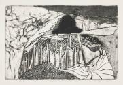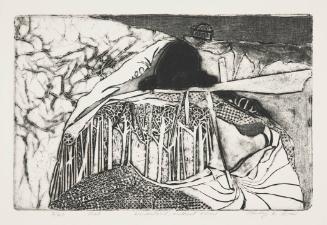 Label Textfrom KIA Traveling Exhibition text: A collograph is a print made from combined material such as cloth, paper, metal or wood which has been printed under great pressure in an etching press. Lea indulges in a bit of humor in this Alice-less landscape.