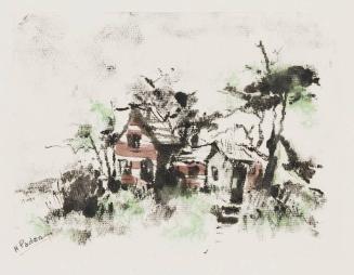 Label Textfrom KIA Traveling Exhibition text: Hazel Paden is a Kalamazoo artist who teaches at the Art Center. This is a small, quick sketch done on location to help her plan a later painting. Notice how she indicated color and dark patterns for her final work.