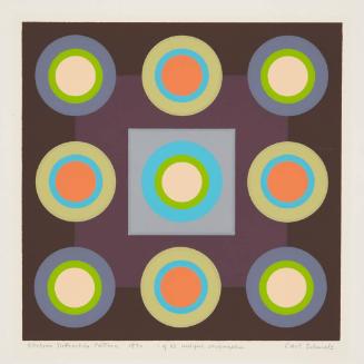 Exhibition HistoryRound and Round, Ethel Denton Groos Gallery, November 4, 2017 - March 4, 2018Label TextCarl Schmalz worked primarily in watercolor, painting landscapes and still lifes. This is a rare screenprint by the Ann Arbor-born artist. Though it is an abstraction, the title references a view at the molecular level. Specialized microscopes can observe electron diffraction patterns: waves that ripple in broadening concentric circles. Scientists can study matter by firing electrons at a sample and observing materials’ signature patterns, such as this image of CCMV-AuNP (gold nanoparticles encapsulated by a virus).