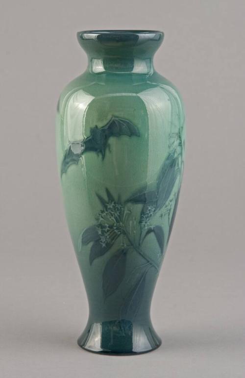 This vase’s sleek shape and plant and bat motifs were likely inspired by the Art Nouveau style then enjoying its heyday in the United States and Europe. Artist John Hamilton Delaney Wareham was also inspired by East Asian ceramics, and the flowers and bats may also reflect this interest. Wareham joined Rookwood’s decorating department in 1893, eventually becoming president of the company in 1934. However, by this time the company was fading into obscurity as the market for luxury goods dried up during the Great Depression.
