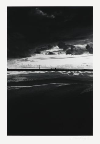 In Mackinac Bridge/Snow #1, Lupp contrasts opposites, such as black and white, far and near, land and water. Each work is composed of two black and white photographs, mounted edge to edge, often forming an artificial horizon line. By juxtaposing a distant perspective (above) with an abstract, textured view (below), Lupp attempts to create a union that brings out the richest qualities of both images.