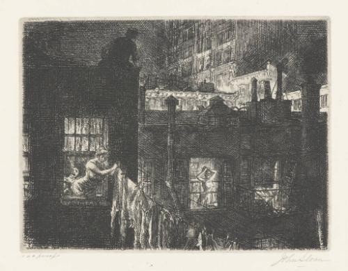 Often working as a printmaker, Sloan’s fine art was heavily influenced by the twelve years he spent capturing contemporary life in Philadelphia and New York City while working for newspapers. Night Windows was exhibited at the landmark 1913 Armory Show, the exhibition often attributed with introducing modernism to the broader American art-viewing public, as an example of new developments in the American art scene.