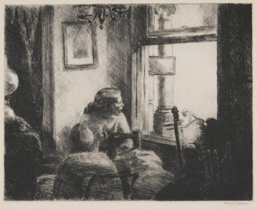 "American Realism: Visions of America 1900-1950," Muskegon Museum of Art (May 11 - August 27, 2023); Flint Institute of Arts (September 9 - December 30, 2023); KIA (January 21 - April 14, 2024).Label TextHopper made East Side Interior at a moment when his career was struggling, and he had begun to focus on printmaking as a more reliable avenue for commercial success than oil painting. However, in prints like this one, he developed some of the themes characteristic of the paintings that would later make him famous. While the Ashcan artists and others captured the crowded busyness, desperation, and violence of early twentieth-century Manhattan, Hopper represented the modern urban experience differently. Instead, he channeled the frequent loneliness and anonymity of city life. The woman sitting at a sewing machine in East Side Interior looks out her window, but what, exactly, has captured her attention remains a mystery. Indeed, the details of this woman’s life, and what we, as viewers, ought to make of her, remain similarly enigmatic – shrouded, perhaps, by the genericness of Hopper’s renderings of objects like chairs, blouses, baby carriages, and light fixtures. As was often the case with Hopper’s work, the answers to such questions linger somewhere beyond the edge of the composition’s frame. Hopper later wrote that East Side Interior “was entirely improvised from memories of glimpses of rooms seen from the streets in the eastside in my walks in that part of the city… The interior itself was my main interest—simply a piece of New York, the city that interests me so much…” ["American Realism" Exhibition Label, 2023]