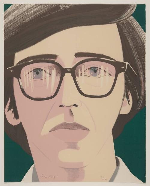 Label TextThe poet Kenneth Koch's immense and thoughtful eyes confront the viewer from behind thick eyeglasses. Although lines on the lenses indicate reflections, they do not impede our direct connection with the sitter's penetrating gaze. The artist presents Koch frontally, up close to the picture plane and larger than life. To emphasize the two dimensional surface, Katz uses flat areas of pink on half of the face to show presence of light. Closely cropped like a photograph, Katz puts a modern twist on the age-old tradition of the portrait.
