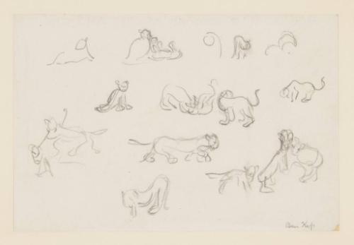 Label Textfrom KIA Traveling Exhibition text: This is a page from Karp's sketchbook never meant to be seen by anyone else. Notice how he has covered the whole sheet with a few lines to suggest the difference in poses of animals. No details were added in any of the tiny sketches.There are no works to discover for this record.