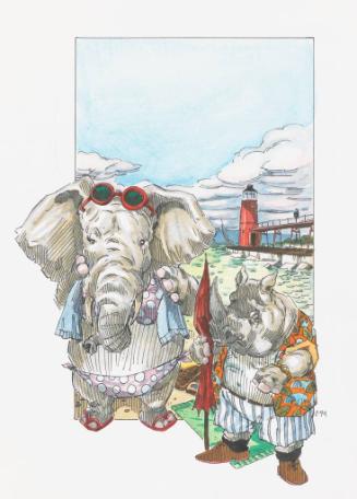 With the exception of tourists, all of the people in Zimmerman’s series are represented by animals native to Michigan. This panel acknowledges the important role of tourism in the state’s modern economy, showing an elephant and rhinoceros from out of state vacationing along the lakeshore. The animals’ clothes humorously cast them as quintessential tourists - a sign of the sense of whimsy that plays a key role in Zimmerman’s series despite its historic subject matter.There are no works to discover for this record.