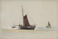 This watercolor is one of a series of works Haseltine made while staying in Blankenberge, a popular seaside resort city in Belgium. It demonstrates both Haseltine’s technical proficiency and his selective, idealizing tendencies. Unlike the hasty sketches produced by many of his peers, Haseltine’s plein air paintings are detailed and attentive, possibly as a result of his fastidious study of drawing technique as a youth and while in Dusseldorf. Meanwhile, rather than show his fellow beachgoers in Blankenburg #2, he instead focuses on the picturesque subject of a trio of commercial fishing boats, which in Blankenberge often landed on beaches to unload their catch.There are no works to discover for this record.