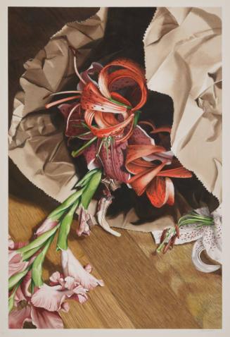 Label TextThis watercolor demonstrates fine detail in its depiction of surface texture in the delicate patterns of the wood grain and the intricate wrinkles and folds of the crumpled paper. Spilling out of the paper wrapping is a bouquet of blush pink gladioli and vivid crimson lilies. The graceful petals and fragile stamens extend beyond the image’s frame, drawing viewers into the scene. Lisiecki draws upon a long tradition of painting and flower symbolism. Gladioli are also known as the Sword Lily due to their sword-shaped leaves. The birth flower for those born in August, the gladiolus signifies remembrance and infatuation, telling the receiver that he or she pierces the heart. It can also represent strength of character, faithfulness and honor. Lilies come in different shapes, sizes and colors. In general, they symbolize purity and refined beauty. Depending on the color or type, the flower can convey different meanings: white symbolizes modesty and virginity, while orange symbolizes passion. Watercolor is unforgiving; it cannot be painted over or corrected. Lisiecki shows her mastery of the medium by tightly controlling the movement of water and paint across the paper’s surface. The artist uses dramatic lighting and shadowing to lure the viewer’s gaze toward the painting’s enigmatic center. Lisiecki was inspired by Sondra Freckelton, a Michigan-born and renowned watercolorist, who she met in 1983 at an artists’ conference. The two later attended a Detroit workshop together and became close friends until Freckelton’s passing in 2019. Flowers in a Paper Bag recalls Freckelton’s realistic techniques, and reflects Lisiecki’s approach to rendering natural forms while heightening their surroundings to convey a sense of tension. Although there are no figures within view, the presence of humans is implied. The unwrapped flowers lying on the wood surface seem to have a story to tell. The flowers may represent being in a state of transition, i.e. the journey from outside (garden or flower shop) into the house, and finally, into a vase. Perhaps the artist alludes to the fragile nature of beauty, while also demonstrating the thin line between prosperity and ruin. Lisiecki, Director of the Kirk Newman Art School at the Kalamazoo Institute of Arts, is an award-winning artist who received a BFA in painting at Miami University, and an MA from SUNY Oswego. She has been represented by galleries throughout the U.S. and has had numerous solo and group exhibitions. Her work can be found in more than 50 museum and corporate collections. She has received grants from the Michigan Council for the Arts and the National Endowment for the Arts. [Collection Highlight]