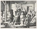 "The American Experience: Prints and Drawings, 1900-1946," KIA (??)Label TextBenton is typical of many Regionalist artists who came from rural backgrounds, studied the latest stylistic trends in Europe, and then abandoned European artistic concerns after returning to America. By 1920 nearly all of Benton’s work was based on the American scene and its folklore. His mature style, with its sharp contours and dramatic patterns of light and dark, was developed to express the energy and tumult he associated with the American experience. Benton wrote that “our basic cultural ideas, our beliefs as to what constitutes the ‘American character,’ our mythologies, had their origins in…earlier conditions.” This was what he wanted to represent in his work. The Meeting, based on a drawing made in 1928 of a meeting house in the mountains of West Virginia, described a scene inside a rural church which served as both a social and religious center for this country community.