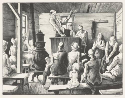 "The American Experience: Prints and Drawings, 1900-1946," KIA (??)Label TextBenton is typical of many Regionalist artists who came from rural backgrounds, studied the latest stylistic trends in Europe, and then abandoned European artistic concerns after returning to America. By 1920 nearly all of Benton’s work was based on the American scene and its folklore. His mature style, with its sharp contours and dramatic patterns of light and dark, was developed to express the energy and tumult he associated with the American experience. Benton wrote that “our basic cultural ideas, our beliefs as to what constitutes the ‘American character,’ our mythologies, had their origins in…earlier conditions.” This was what he wanted to represent in his work. The Meeting, based on a drawing made in 1928 of a meeting house in the mountains of West Virginia, described a scene inside a rural church which served as both a social and religious center for this country community.
