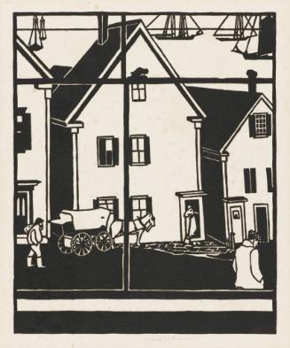 A Provincetown Print is a woodcut that presents a modern vision. It does not need to be a multi-color print. Its contemporary spirit can be in its technique, subject matter, or as in the case of this woodcut, in its design. Notice the clear geometry that defines the composition. McMillen employed a brevity of lines and forms to transform the scene from a foreground interior through a window frame and across a street to Provincetown harbor. She restricted the use of curved lines for almost nothing except a few figures, the horse-drawn wagon, and some boat hulls (written by Nancy Sojka for Passion on Paper: Mastery Prints from the KIA Collection, 2018)."