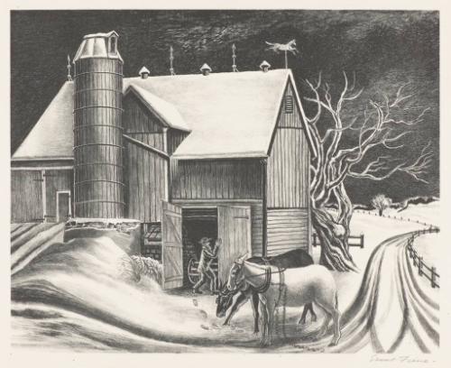 Exhibition History"36 Regionalist prints from the KIA," Dennos Museum Center (Sept. 8 - Nov. 24, 1996), Ella Sharp Museum, Jackson, MI (May 17 - July 13, 1997), Midland Center for the Arts (Aug. 2 - Sept. 21, 1997).Label TextA native of Germany who came to the United States in 1912, Fiene was known as an author and teacher as well as an artist. An instructor as the Art Student League in New York from 1938 until his death, he found subject matter for his art in the New England landscape and in motifs drawn from the Hudson River area and New York City. His work is characterized by a strong sense of composition and truth to the subject. This view of a farmer beginning work on a cold winter day shows Fiene’s interest in solid structure and compact pattern.