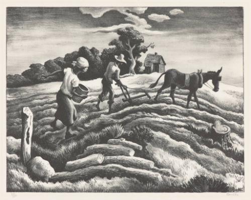 Label TextAfter and early flirtation with modernist art in Paris, Benton returned to the US where he devoted himself exclusively to American subjects. His compositions always show a concern for rhythmic patterning. The vigorous, curvilinear lines in Planting are characteristic of both his paintings and his prints. This lithograph is based on a 1938 drawing made in southern Arkansas. Benton later wrote, “The man plows, the woman sows. Common enough scene up to very lately – maybe it is still to be found. Old ways don’t die easily.”