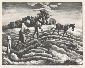 Label TextAfter and early flirtation with modernist art in Paris, Benton returned to the US where he devoted himself exclusively to American subjects. His compositions always show a concern for rhythmic patterning. The vigorous, curvilinear lines in Planting are characteristic of both his paintings and his prints. This lithograph is based on a 1938 drawing made in southern Arkansas. Benton later wrote, “The man plows, the woman sows. Common enough scene up to very lately – maybe it is still to be found. Old ways don’t die easily.”