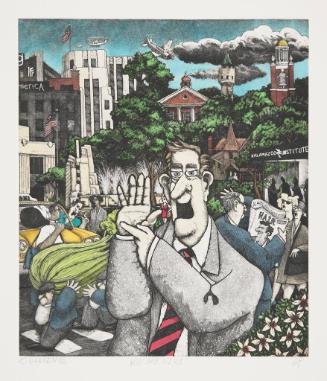 In You are Here, Hansen condenses the elements he considers representative of Kalamazoo, where he studied and emerged as a professional artist in the 1970s-80s. In the background, local architecture and monuments are assembled in a compressed Kalamazoo skyline. Hansen's "everyman" caricatures humorously represent the people of the city with reference to local history, cultural institutions, business, and agriculture. And of course, the windows of the KIA reveal a festive event—perhaps the opening of Hansen's 1992 retrospective for which this print was made.