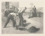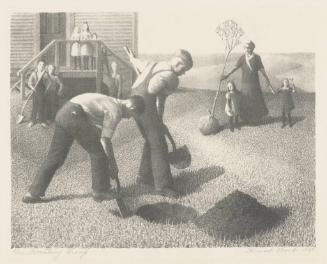 Label TextMany images in Grant Wood’s art involved allegorical themes that reflected the values he held dear. One recurring figure is that of the woman as conservator and caretaker of the garden. In Tree Planting, this figure appears in the form of a schoolteacher, who watches her older students dig a hole in which to plant the tree she supports with one hand. Her role as a teacher in the country school is extended metaphorically to include teaching the children what their responsibilities and duties will be when, as adults, it is their turn to care for the land. This print is based on a drawing Wood created in 1933, when we witnessed a similar scene.