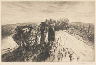 Label TextVirtually self-taught, John Costigan was not influenced by the various styles and experiments of 20th century art. He remained consistently occupied with a few specific subjects: his farm and the landscape around his New York home, farm animals and his growing family. His attention to the mundane activities associated with farm life earned him the label of “the Millet of American painting.” The heavy peasant forms and faithful description of fatiguing farm labor in Costigan’s prints seem very reminiscent of the French master.