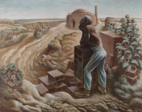 Looking at the Sunshine showcases de Martelly’s frequent elongation of space, a characteristic of his work shared with that of Thomas Hart Benton, his friend and colleague at the Kansas City Art Institute in the 1930s and ’40s and a fellow Regionalist painter. Benton had been inspired by 16th-century Mannerist artists like El Greco, who likewise represented elongated figures and asymmetrical, seemingly impossibly unstable spaces. Though Regionalism is most commonly associated with Benton and contemporaneous artists John Steuart Curry and Grant Wood, de Martelly’s work is an example of the broader popularity of rural Midwestern subject matter in the 1930s. The seeming dryness and barrenness of the land surrounding the kiln may be an allusion to the ecological challenges confronting rural Americans in the Dust Bowl era, as many were forced to leave the Midwest or abandon farm work for other professions – a topic also often addressed in Regionalist painting.
