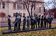 People represents the artist’s first large-scale, public sculpture. It depicts a row of figures engaged in animated cocktail conversation. With loosened inhibitions, the participant’s true personalities start to emerge—note the man with a paper bag on his head. Newman humorously presented personality types, though some Kalamazoo residents found the figures bore more than a passing resemblance to local individuals. The original figures were created in plaster, a medium that the artist found ideal for developing both form and texture. He would later do similar pieces for locations in Toronto and Hong Kong.
