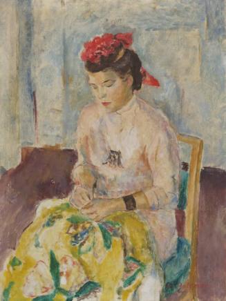 Lady with a Quilt is a portrait of Iris Praus, a polyglot, a lover of fashion and antiques, and a former secretary for the A. M. Todd Company in Kalamazoo. The painting not only honors “women’s work” but also exemplifies Hodgman’s colorful, vigorous, and expressive brushwork. [Label for "Art, Music & Feminism in the 1950s”, 2023]