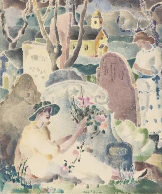 Gilmore was a great experimenter. She varied both the colors she used and the manner in which she painted the segments from impression to impression. Notice how the faces of the women are unique portraits, as are the flowers. Multi-colored pigment application in areas such as the tombstone at the feet of the figure in the foreground and the steeple of the church are hallmarks of the Provincetown printing style (written by Nancy Sojka for Passion on Paper: Masterly Prints from the KIA Collection, 2018.)"