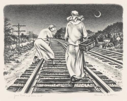 Label TextIn discussing the sources of inspirations for his work, Clarence Carter said, “It is the mysterious and magical elements in life which have always captivated me, things suggested but only partly seen.” This lithograph, based on his painting in the Museum of Modern Art, possesses such qualities. The subject was not unusual or strange during the Depression years: two women search for pieces of coal along a railroad track in Kentucky. But Carter’s treatment of the figures, their backs tot eh viewer and heads shrouded in sunbonnets, encourages a more imaginative interpretation. In their evocations of mystery and silence, the Midwestern scenes that Carter depicted in the 1930s and 40s anticipate the surreal images of his later work.