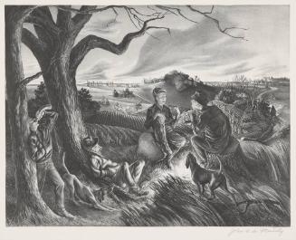 Label TextBoth of the composition and the narrative content of the Blue Valley Fox Hunt are reminiscent of deMartelly’s mentor, Thomas Hart Benton. The lines and patterns of the fields are rhythmic variations on Benton’s late style, just as the Native American subject suggests Benton’s usual themes. The humorous scene of “hunters” drinking, snoozing and spinning tall tales around a campfire is, however, deMartelly’s own. He makes his own sly reference to Benton by depicting the older artist sitting against a tree sound asleep.