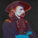 Label TextAndy Warhol’s reappropriation of renowned Civil War photographer Mathew Brady’s 1860s-era photograph of General Custer is curious. Custer, best known for his military campaigns against the Lakota Sioux and Cheyenne nations between 1866 to his death in 1874 at the Battle of Little Bighorn, is a controversial historical figure. Shown in profile, a popular pose of the era associated with phrenology—a pseudoscience used to assert white superiority—Warhol grounds the [in]famous general against a black background, tints his gloves bright blue, and accentuates Custer’s uniform with gleaming gold buttons and bars. However, Warhol has starkly outlined and contoured Custer’s figure, uniform, hat, face, and hair in deep shades of red.