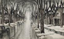 Label TextLook up this long stretch of road, deserted except for some cars and a few lighted windows. Count the trees until they become indistinct against the grey horizon. You can feel the chill in the air and hear the crunch of the snow. Growing up in Ohio, Charles Burchfield was certainly acquainted with the chilling greyness of a midwinter day. This expertly painted watercolor features Linwood Avenue in Buffalo, New York, but it could be any of hundreds of streets in America.