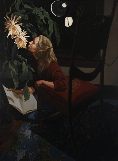 This work is one of a series exploring the four senses. Beal invites us into a warmly lit interior space where the air is seemingly thick with perfume. A young woman sniffs a large flower, a Night-Blooming Cereus, also known as "Queen of the Night." The artist accurately portrays the flower, which needs bright interior light and only blooms for a few hours between 8 p.m. and midnight in the summer. It is a magical, sensual experience that is expertly captured by Beal in paint.