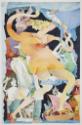 In the 1960s, Gladys Nilsson was a member of the Hairy Who artist group in Chicago. Like the Surrealists of the 1920s, the Hairy Who had a high representation of women in their collective, and they often depicted women as strong, larger than life characters. In Sheets of Rain, Nilsson's protagonist is so large she would exceed the size of the paper if she stood up straight. About her contorted figures Nilsson said, “I love to watch people. I collect postures, in my mind, when somebody doesn’t think that they’re onstage so to speak, when they’re slumped or moving in a strange or exaggerated manner.”