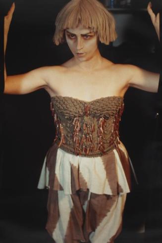 Sherman's Fashion series of 1983-84 emphasizes the contrived world of clothes, hair and style created by the fashion industry. The closely cropped image, dark background, dramatic pose and lighting of this work all echo conventional fashion photography. But Sherman subverts the concept of unattainable beauty by presenting a less than ideal image of a female dressed in shabby, outrageous clothes and a cheap wig.