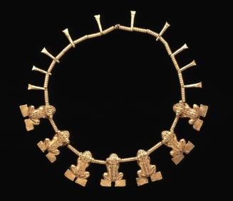 "Unveiling American Genius," KIA Permanent Collection Exhibition, Traditional, Markin, Nay and Groos Galleries (March 1, 2021 - December 31, 2023).Label TextUnlike Europeans, Pre-Columbian people never used gold for coinage or exchange. Beautiful, bright, reflective, impervious to decay—these are gold’s intrinsic qualities that Pre-Columbian people valued. Objects like this frog necklace survive because they were hidden or buried with their original owners until their graves were uncovered hundreds of years later. Pre-Columbian artisans were exceptional metal workers who used the “lost wax” method to create detailed, lightweight, hollow castings with delicate filigree. The wearer of this necklace likely aimed to dazzle and impress.