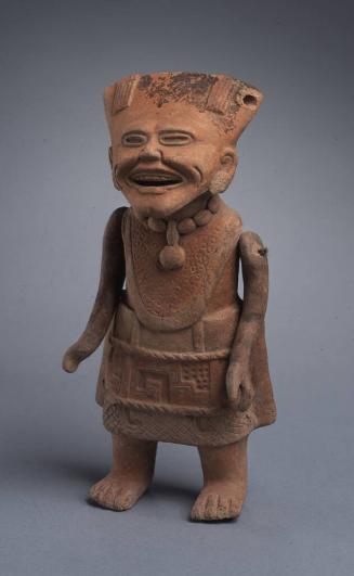 "Unveiling American Genius," KIA Permanent Collection Exhibition, Traditional, Markin, Nay and Groos Galleries (March 1, 2021 - December 31, 2023).Label TextNo one knows the reason for the large smile on this clay figure. Many Smiling Figures have been uncovered in graves and deposits of ceremonial objects. Some scholars speculate the figures are associated with Xochipilli, the Aztec god of dance, music, and joy. A more ominous interpretation is that they represent ceremonial sacrificial victims, their smiles the result of drug-induced euphoria. Whatever their purpose, we can