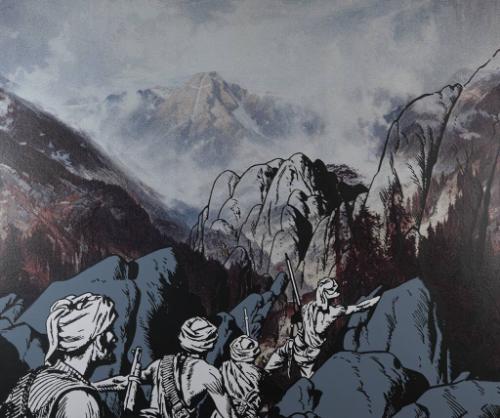 Kearns often uses art to make political statements. Here, he outlines armed figures moving through a mountain landscape using the familiar visual shorthand style of the comic book. He superimposes the figures on an iconic symbol of Manifest Destiny, which was a 19th century view of the United States as a divinely favored nation with a mission to spread its institutions and values. Kearns adds another layer to his commentary by titling this painting Right of Way.
