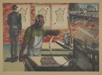 Exhibition History"Large Format Works on Paper," KIA Galleries 3&4 (June 27 - Sept. 2, 2003). "Energy and Inspiration: African American Art from the Permanent Collection," KIA Long Gallery (Jan. 13 - April 14, 2006). "Highlights of the KIA Permanent Collection, (purchased with Auction funds)," KIA Gallery 5 (Sept 9 - Oct. 14, 2006). "Markings of the Millennium", KIA second floor hallway (Jan. 24, 2007 - March 1, 2008). "Embracing Diverse Voices: African-American Art in the Collection of the Kalamazoo Institute of Arts," KIA Galleries 3&4(Oct. 3 - Nov. 29, 2009). "Embracing Diverse Voices: 80 Years of African-American Art," KIA Traveling Exhibition, Bakersfield Museum of Art (Dec. 13, 2012 – Mar. 10, 2013). "Common Ground: African American Art from the Flint Institute of Arts, Kalamazoo Institute of Arts, and the Muskegon Museum of Art," FIA, Flint, Michigan (Feb. 8 - Apr. 26, 2015), KIA, Kalamazoo Institute of Arts (Aug. 21 - Nov. 15, 2015), Muskegon Museum of Arts, Muskegon, Michigan (Dec. 10, 2015 - Mar. 10, 2016) "Resilience: African American Artists as Agents of Change," [Travel Version] at the Dennos Museum Center, Traverse City, MI (June 6, 2021 - August, 15, 2021)Label TextBlackburn was created in homage to master printer Robert Blackburn, who passed away in April 2002. Considered a legend in the printmaking world, Blackburn established The Printmakers Workshop, a cooperative press that is the oldest non-profit lithography workshop in the United States. He is also known for his pioneering efforts in abstract color lithography. An African-American artist as well as a master printmaker, Blackburn supported and encouraged the careers of other African-American artists like Romare Bearden, Faith Ringgold and Jacob Lawrence. Ron Adams, another African-American artist and master printmaker, retired from printmaking after 25 years to devote himself to making his own art full time. Finding great inspiration from earlier masters like Dürer, Goya, Kollwitz as well as the Mexican muralists, his style is classically realistic but one that incorporates aspects of 20th century expressionism, seen clearly in the exaggerated musculature of his figures. His palette tends to be monochromatic which highlights his confident line, sense of mass and strong use of light and shadow. His figures seem focused inwardly, confined and solitary in their own thoughts and feelings as well as in their pictorial space.