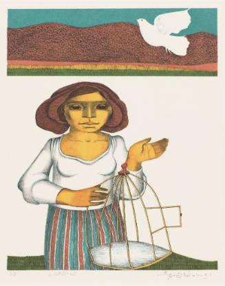 "What Is Going On In This Picture?" KIA Upjohn Mason Grandchildren Interactive Gallery (Sept. 10, 2022 - Feb. 26, 2023).Label Text"Libertad is a well-crafted image that begs discussion. The title refers to all forms of freedom, of possessing it, and permitting it. We can muse about the levels of freedom intended for the individual and with research, we could determine if any significance could have been implied toward the politics or history of the time. The lithograph includes a few classic symbols with which to contend. The open cage held by the woman is yellow, perhaps a reference to being “gilded.” The bird is no ordinary creature but the white dove of peace. It flutters against an isolated zone of pure landscape that seems more like another picture within the picture than just an ordinary distant background.